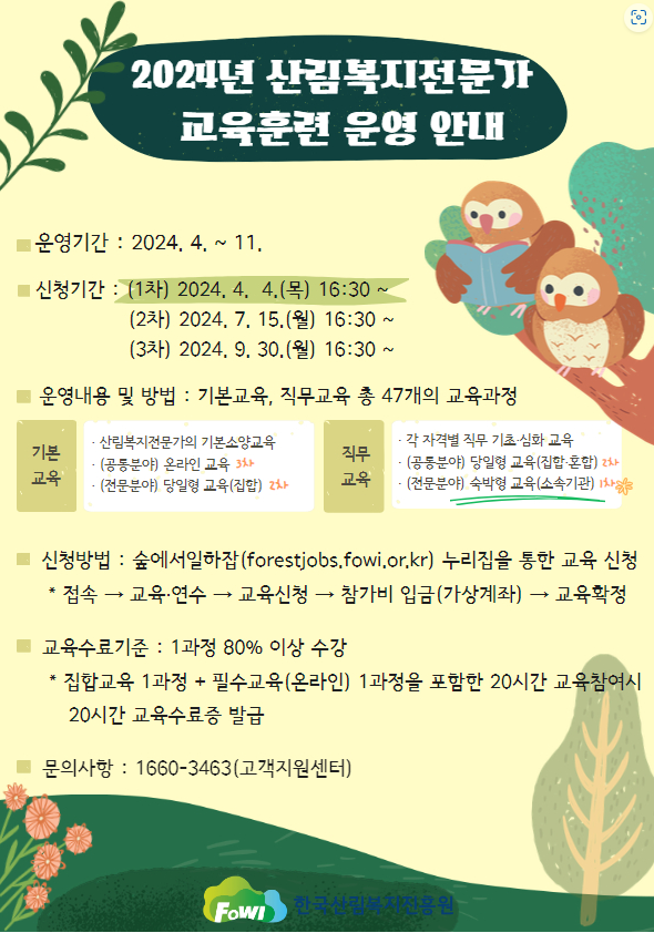 2024 한국산림복지진흥원 산림복지전문가 역량강화 교육훈련 안내와 신청 및 교육내용 첨부합니다.